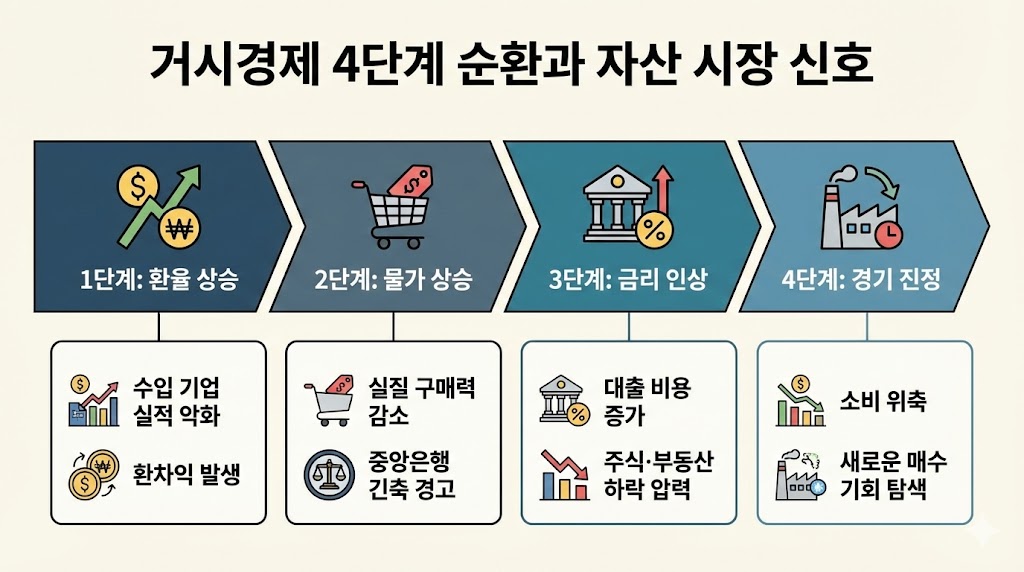 1단계: 환율 상승 수입 물가 상승, 달러 가치 강화 수입 기업 실적 악화, 환차익 발생